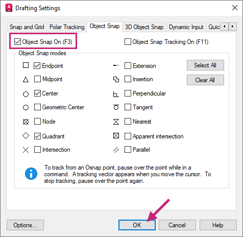 Click Object Snap On, if it is currently unchecked, and then click OK.