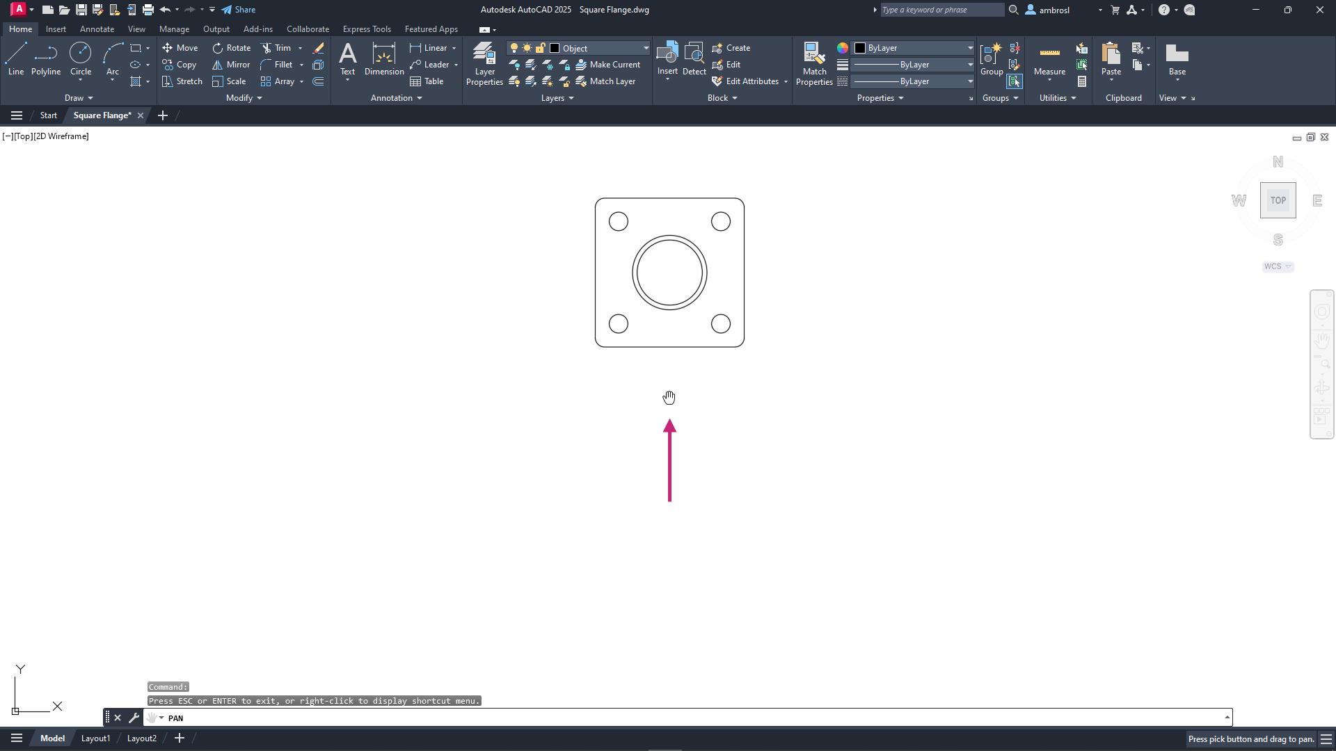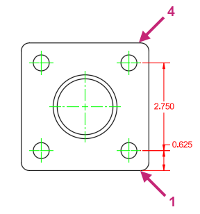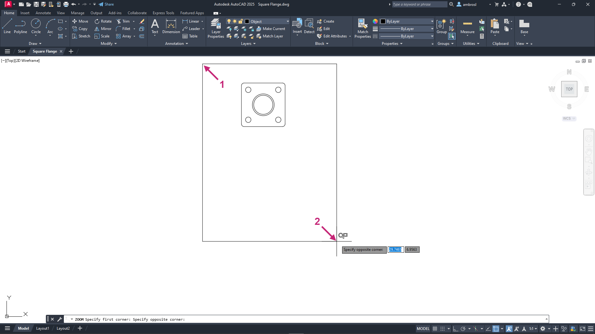 Zoom and pan to the objects which define the top view of the square flange.