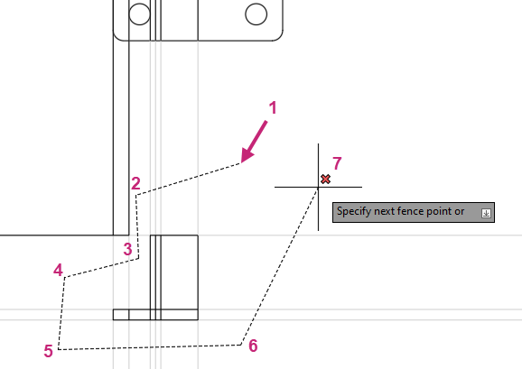 At the Specify first fence point or pick/drag cursor: prompt, specify the points as indicated in the following image.
