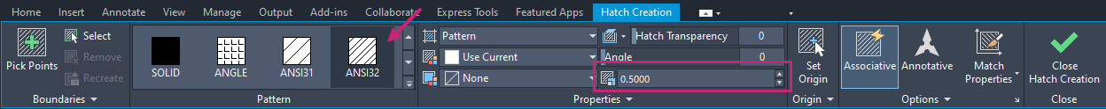 From the Hatch Creation contextual tab > Properties panel, click in the Hatch Pattern Scale text box, type 0.5, and press Enter.