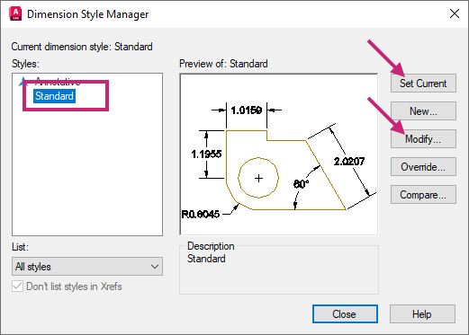 In the Dimension Style Manager dialog box, under Styles, select Standard from the list and click Set Current.