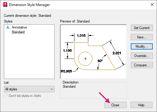 In the Dimension Style Manager dialog box, click Close to exit the dialog box.