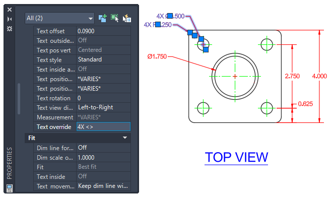 On the Properties palette, under the Text section, click the Text Override field and enter 4X <>.