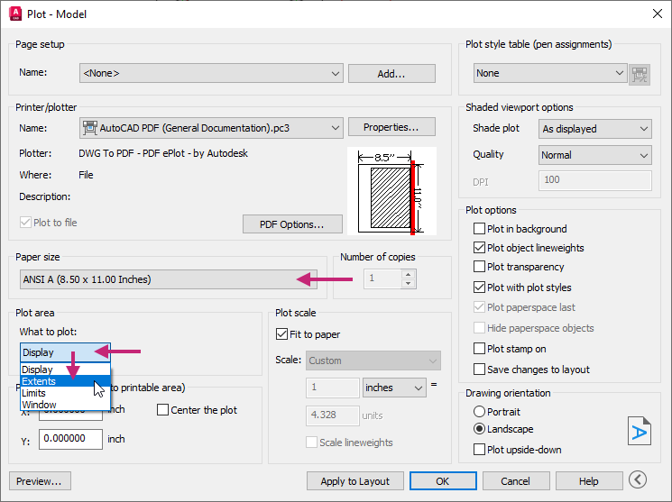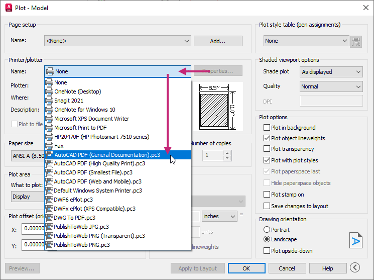 In the Plot - Model dialog box, under Printer/Plotter, click the Name drop-down list and choose AutoCAD PDF (General Documentation).pc3.