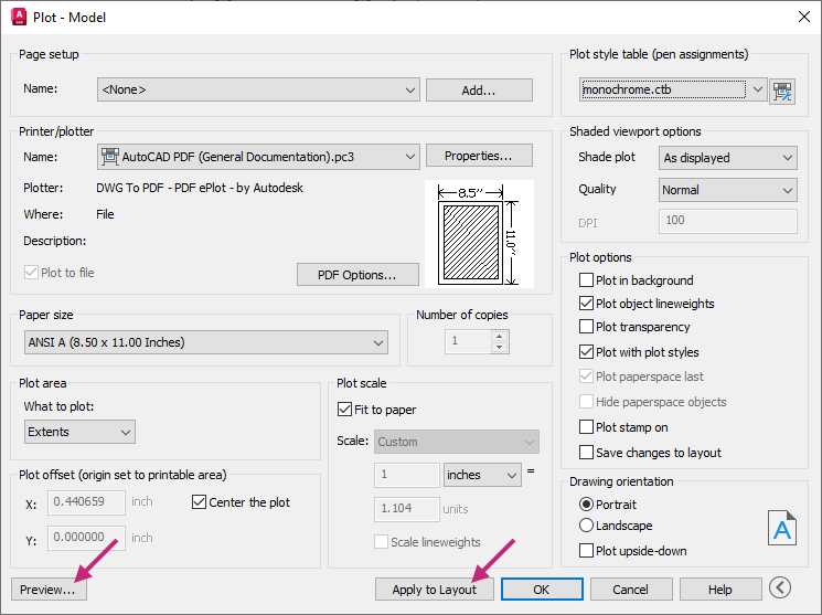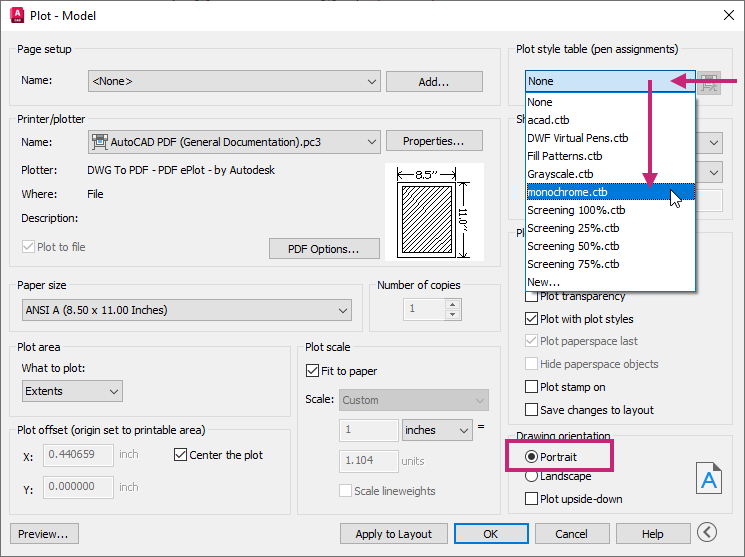 Under Plot Style Table (Pen Assignments), click the Plot Style Table drop-down list and choose monochrome.ctb.