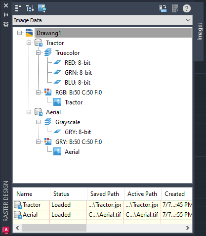 The Image Manager toolspace displays the structure of image data associated with a drawing. Within this dialog you can manage image files, change their display order or their active path, edit color maps, and export images to other locations.