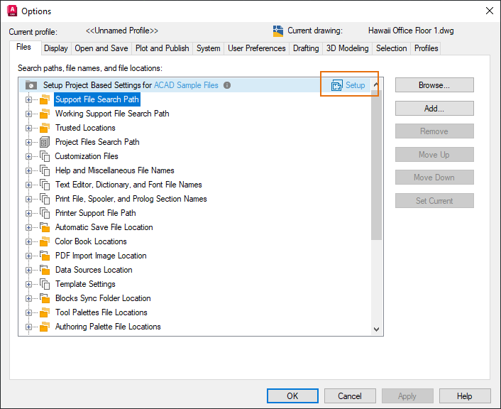 To set up project-aware support files, display the Options dialog box and click Files Tab > Setup.