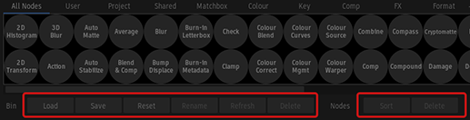 Reorder nodes. You can now reorder nodes in the Project, User, Shared, and custom bins without using a keyboard shortcut. Simply grab a node and drag it down to detach it from the bin. Once the node is following the cursor, a blue line shows where the node will get inserted when you drop it.