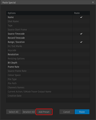 When a Clip node is selected, the Metadata Overlay displays the same information as in the Player. For other nodes, only the information relevant to each node is displayed. Layers that contain information not relevant to the selected node are greyed out.