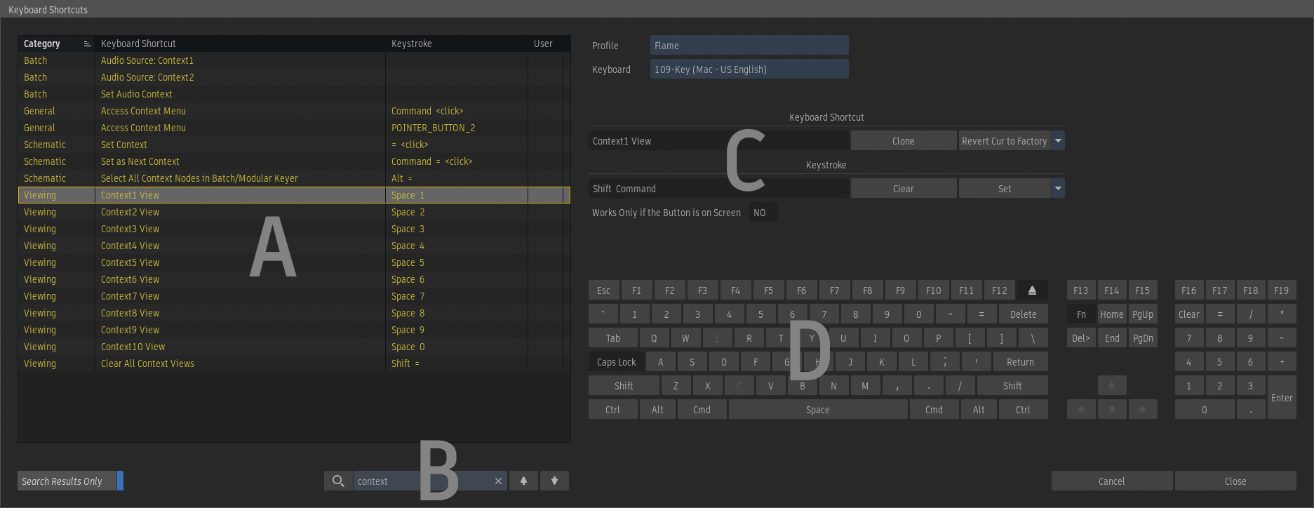 (A)Keyboard Shortcut Catalogue (B)Search Field (C)Keyboard Shortcut Manager (D)Active Keyboard