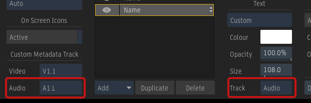 The Custom Metadata Track section contains the Video track selection menu, and the new Audio track menu.