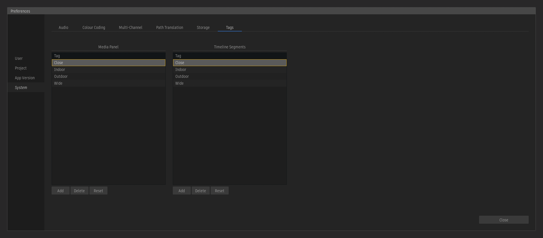 To manually add a tag, use the Add button below the Tags list. To rename or delete a tag, either open the context menu for a tag within the list or use the Manage button.