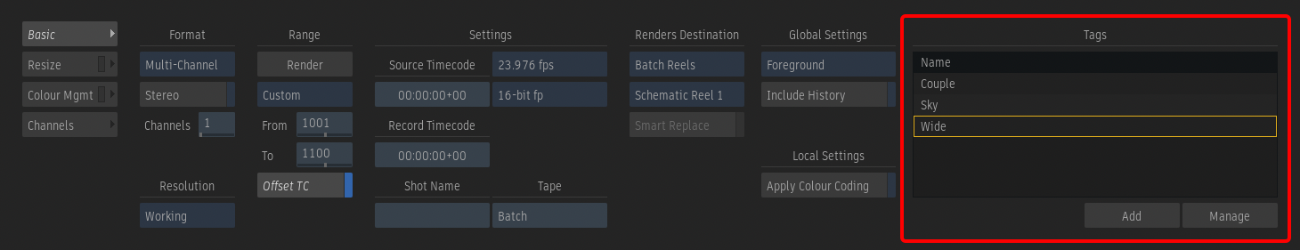 Tags can be added to a Render node, making them automatically present on every new clip originating from it.