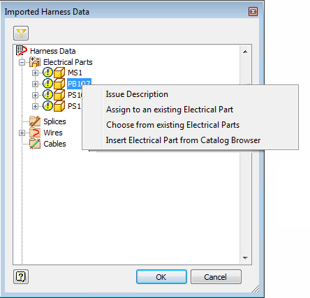 Expand Electrical Parts and select an electrical part on the Imported Harness Data dialog box.