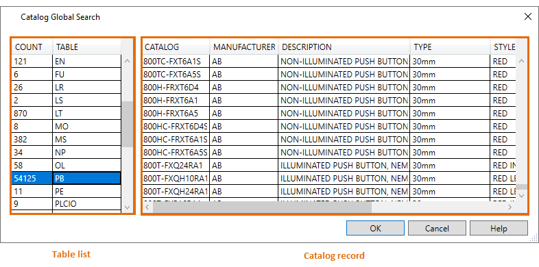 Displays the catalog records in the selected table that match the search value. Click a column heading to sort the records based on the values in that column.Note: Sub-assembly items, as defined by an ASSEMBLYLIST value, are included in the search results. The global search results are based from the Catalog, Manufacturer, and Assembly Code column records.