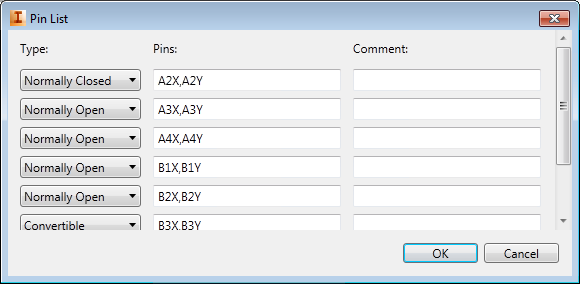 The pinlist is written to the database in the format required by the program, for example: 1,A1X,A1Y;2,A2X,A2Y;1,A3X,A3Y;1,A4X,A4Y;1,B1X,B1Y;1,B2X,B2Y;1,B3X,B3Y;1,B4X,B4Y.