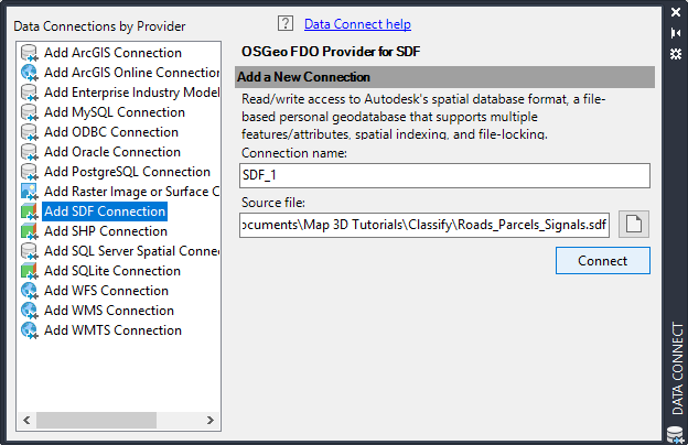 In this exercise, you connect to the new SDF file you created and see the feature classes that were created from the three object classes.