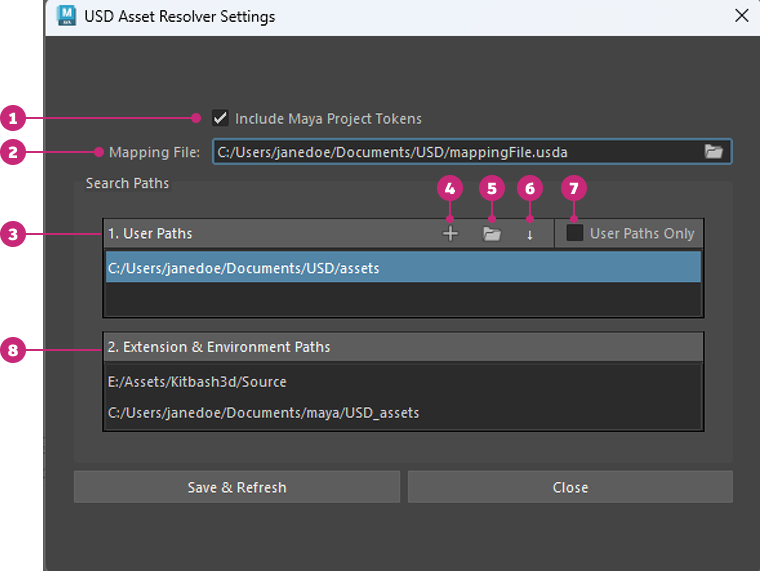This dialog lets you manage how USD resolves asset paths in Maya. It defines where and how the resolver searches for assets, including project tokens, user-defined paths, and environment variables.