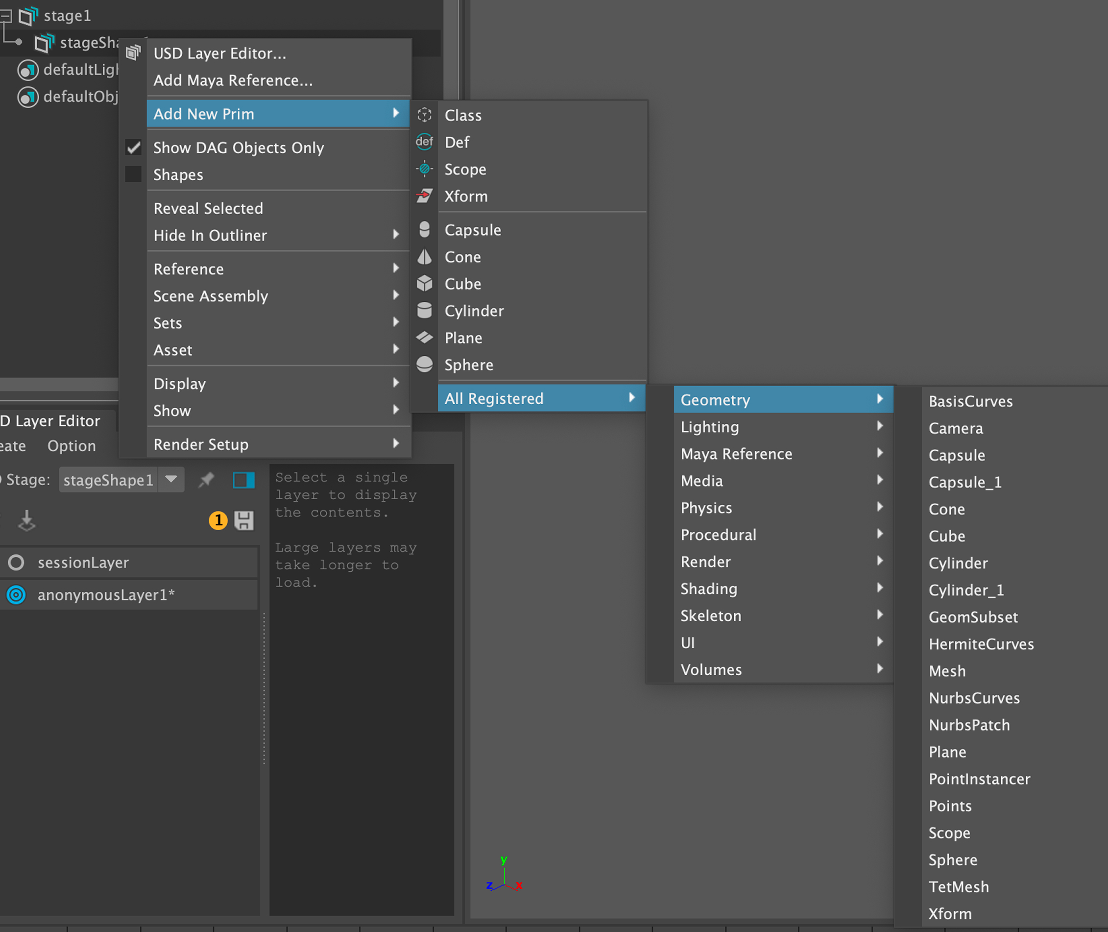 To differentiate between various prim types, USD data in Maya features a unique set of prim icons and composition arc badges that are viewable from the Outliner.