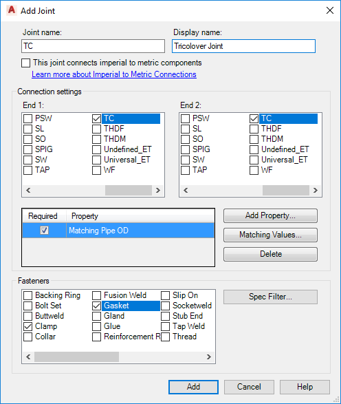 Joint types that support imperial to metric connections are distinct from same-unit joint types. This allows you to specify matching properties such as 150#, 10PN.