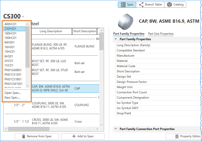 Click any cell in the part list table within the spec or catalog property editor dialog boxes to enter an edit mode and make changes. You can also make changes in the cell using shortcut keys such as Ctrl, Ctrl+A, Shift, Enter, Tab, Esc, Delete, and arrow keys.