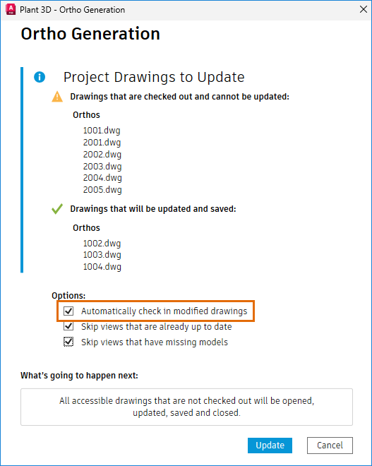 If you do not select this option, you must manually check in the affected drawings.