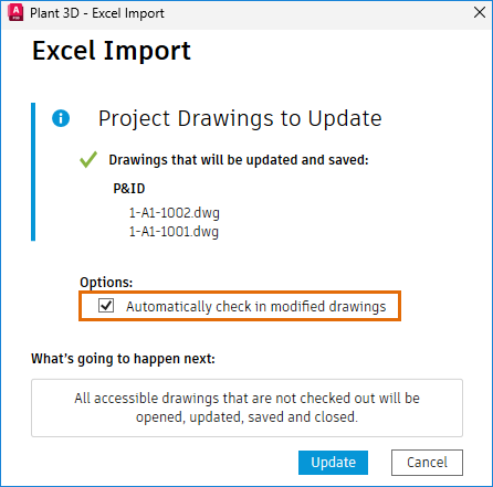 When you select this option during an audit, AutoCAD Plant 3D automatically checks in all affected drawings at the end of the audit. If you do not select this option, you must manually check in the affected drawings.