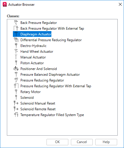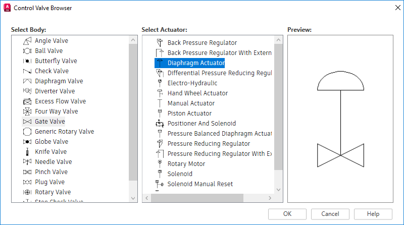 The Control Valve Browser dialog box now displays individual icons for all valve body and actuator classes. It also creates a preview of the combined control valve when you select a body type and an actuator type from the lists.