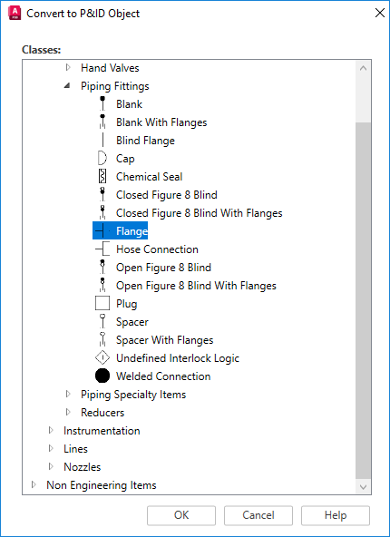 The Convert to P&ID Object dialog box now displays individual icons for all P&ID classes.