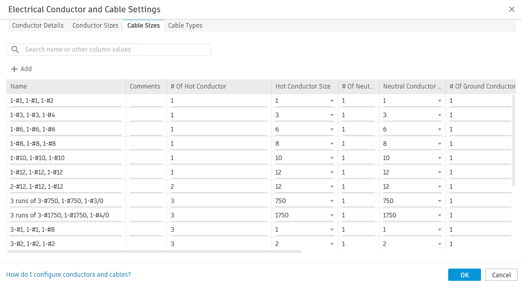 Use this dialog to specify wiring and cable parameters. Use the defined conductors in circuits in your model's electrical designs.
