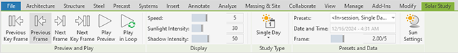 Presets and Data: The controls depend on the type of study you are previewing. For the Still Image study type, you can select the current preset, and set the current date and time for the study. For the Single Day and Multi-Day study types, you can select the current preset, see the current frame date and time, and set the current frame for the study. For the Lighting study type, you can select the current preset, and set the azimuth and altitude for the study.