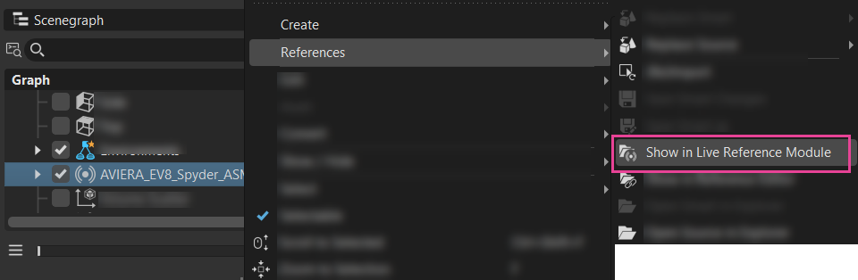 To make it easy to find a reference node, we added Show in Reference Editor to the Scenegraph > References context menu. This opens the Reference Editor with the file selected and highlighted. Use this when troubleshooting an issue with a file.