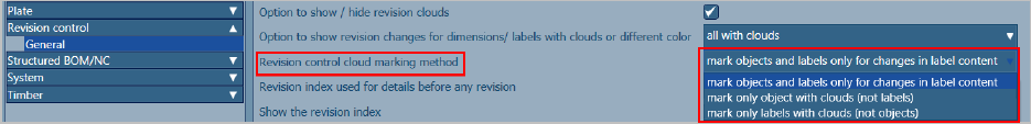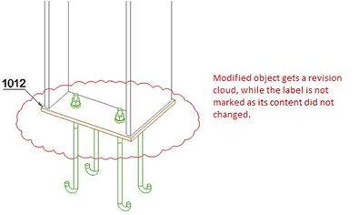When a drawing is updated with revision, the revision changes can be marked with clouds around the objects that were modified in the model. In addition to the revision marking of the modified object, it is possible to display revisions around dimension lines and labels which change their content during update.