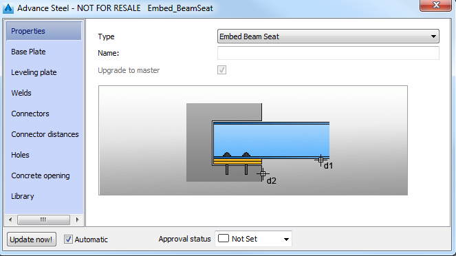 The Embed Beam Seat joint can be used between any types of concrete elements (wall, slab, column, foundation and beam) and some of the steel sections (I, T, C, L, Hollow rectangular/square, welded, compound or tapered sections).