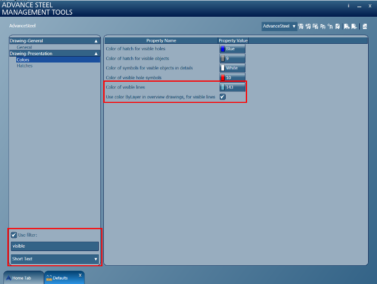 If the "Use color ByLayer in overview drawings, for visible lines" option is disabled, then the color of visible lines of the elements in general (overview) drawings will be set according to the "Color of visible lines" default.