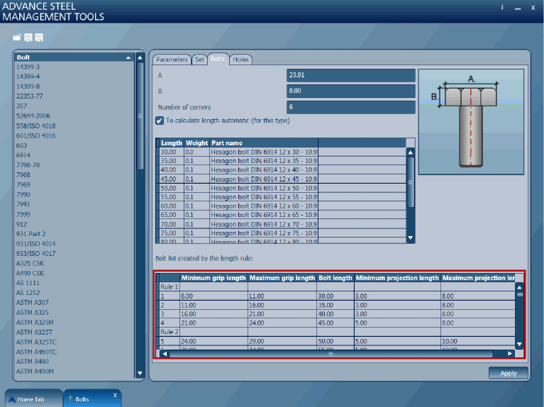 After the rule information has been added to the fields, click Apply. This will automatically calculate the grip for the other bolt lengths, for this rule. It adds enough lines based on the increment to reach the maximum grip length and then it will stop.