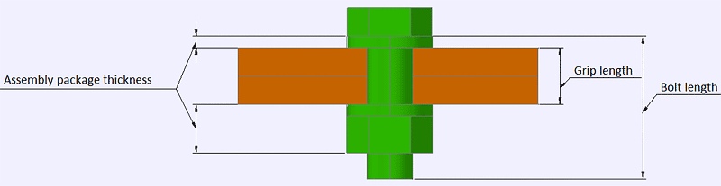 - Minimum and maximum bolt grip: These values are taken from the bolt standard, but do not include the grip package thickness, which must be calculated by taking the thickness for each nut and washer included in the assembly. This value is subtracted from the minimum grip length for the bolt. The maximum grip length is calculated in the same way, but the value, from the table from which we subtract the thickness of the grip package, is the maximum grip length corresponding to the bolt length rule.