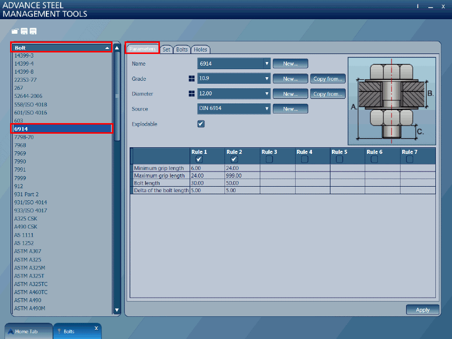 - On the Parameters tab, the grip length, bolt length and projected lengths can be configured.