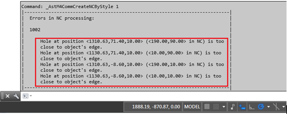 During the creation of a NC file, an error message may appear on the command line, and the NC file is saved with the 'err.' extension. In this case the NC file is functional, but the hole coordinates display the message that they are too close to the edge.