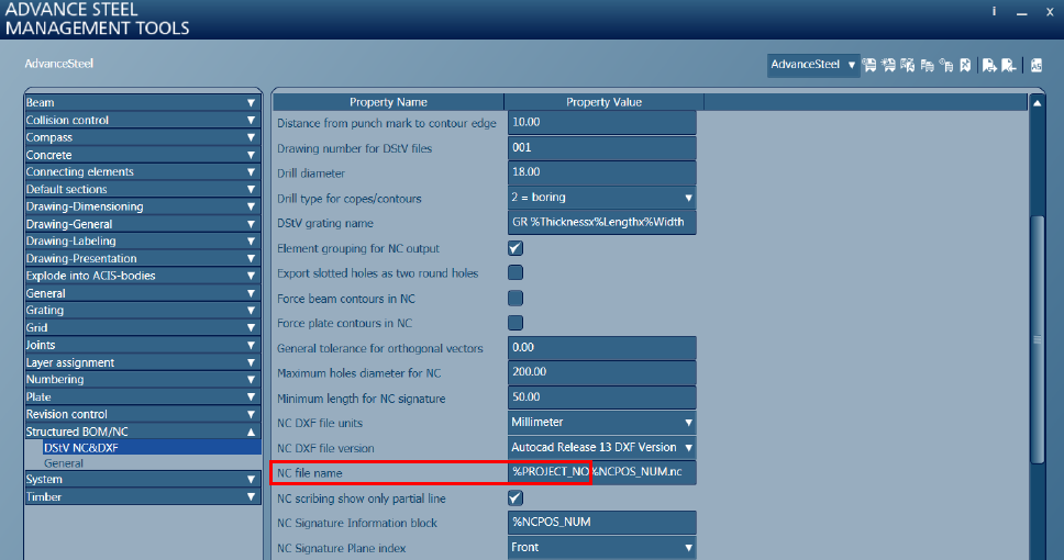 - Select that Option and you will see the dialog change to show the Value currently available. The current default is set just to show the part number of the component, either the single or Main part depending on the NC settings options set within Advance Steel ( files can run for either single or main parts). It is possible to add additional tokens to this Value and in this instance we can add "%PROJECT_NO". This corresponds to the Project number set in the