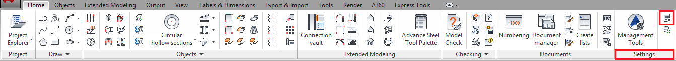 - using Update defaults on the same Advance Steel tools ribbon tab, from the Settings panel.
