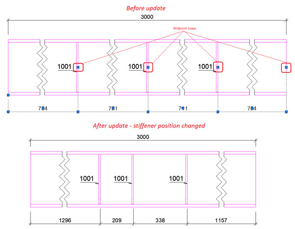 Any additional hole/bolt center snap points chosen from in between the extremities, as long as we do not choose all of them (see next point), are removed during update without affecting the correct snap points.