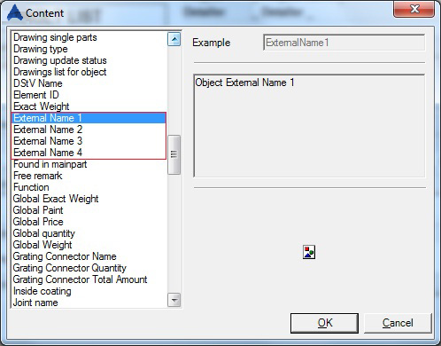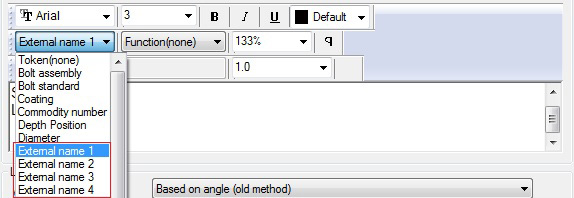 The mapped information from the External1 - 4 columns can be displayed in BOM templates and drawing (labels, detail names) through a series of contents / tokens named External 1 - 4 and they evaluate the respective column information if the object they are attached to corresponds to the mapping priority and value preset in the "Internal" column.