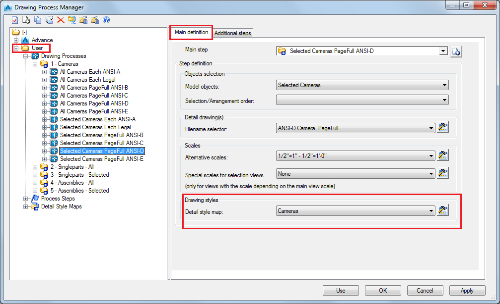 Your camera details are created using the drawing style set in the process detail map, for each type of camera: