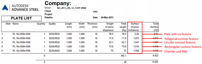 The total surface or paint area of plates can be displayed in BOM lists. The surface value takes into account any contour feature, chamfer or fillet which is present on the plate.