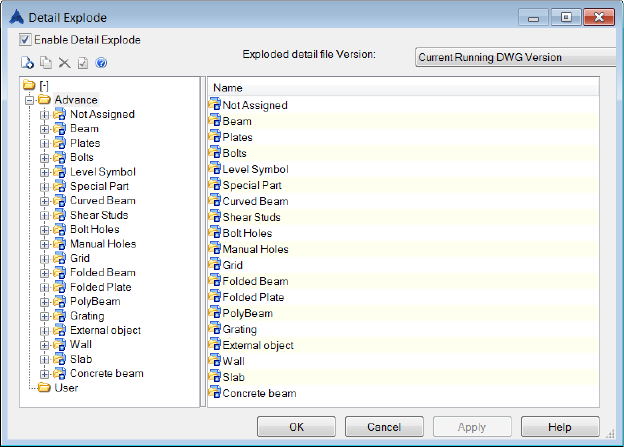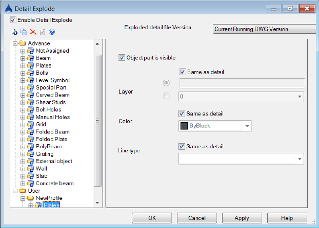 While exploding the detail, for each object / sub-object a corresponding setting will be searched in the "Current Profile". If there is no setting, the explode settings will be used from Advance Steel category.