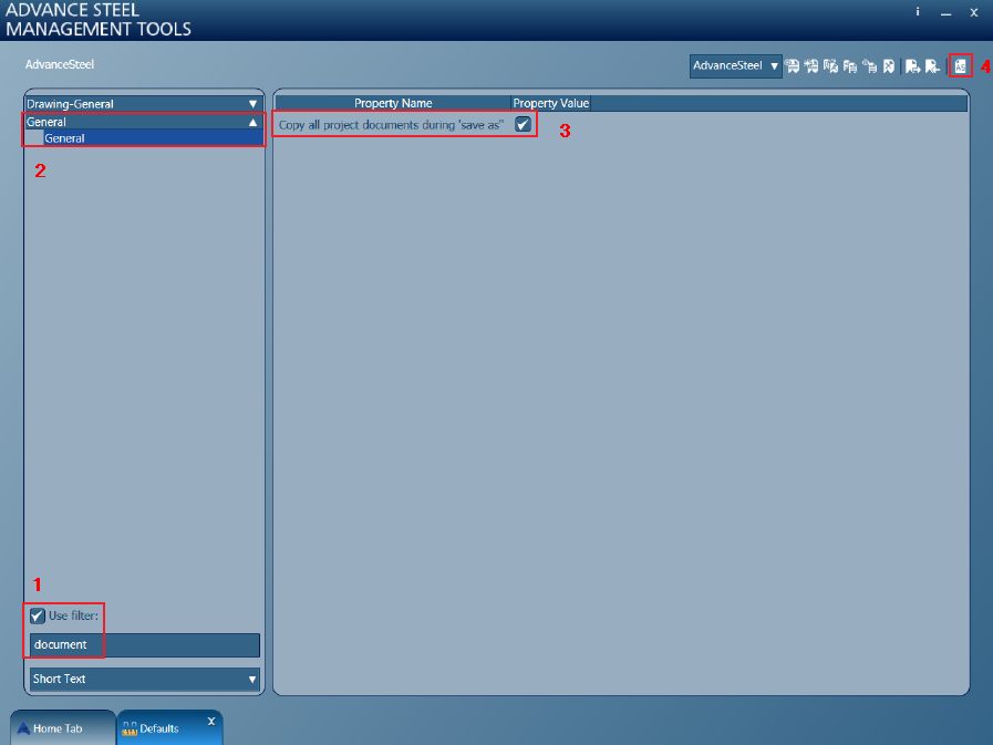 Enable the filter and then write "document" in the filter field (1). Open the General category (2) and activate the Copy all project documents during 'save as' default in the Property Value column (3). After the default is activated click Load Settings in Advance (4) and then close the Management Tools .