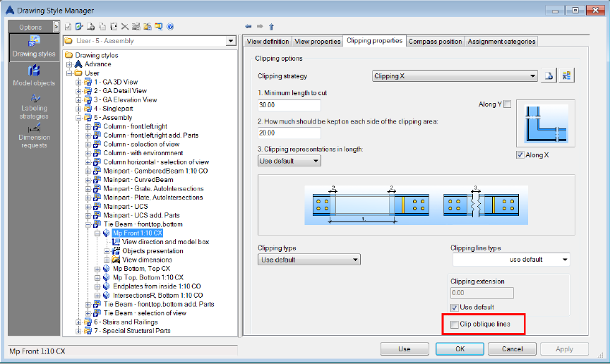 - On the Clipping properties tab of the concerned view (e.g. Front view), unselect the Clip oblique line option.