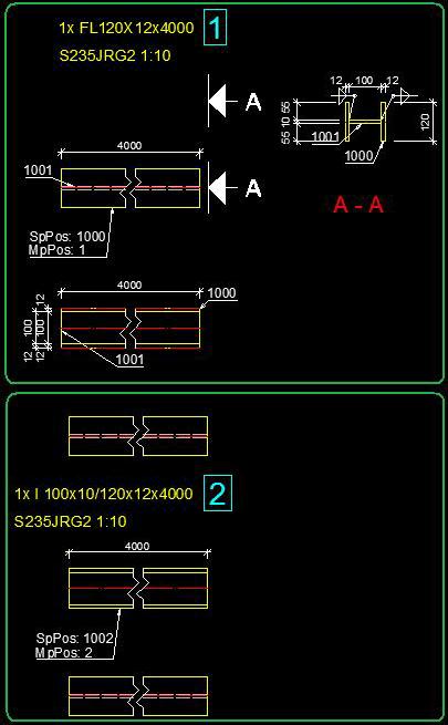 The behavior as split profiles involves that the numbering proceeds as follows: each one of the profiles that define the compound section will receive a single part number and the same number for the assembly mark. For example, the assembly number is 1 and the single part numbers are 1000 and 1001. Also the representation type of the compound profile must be "Separated".