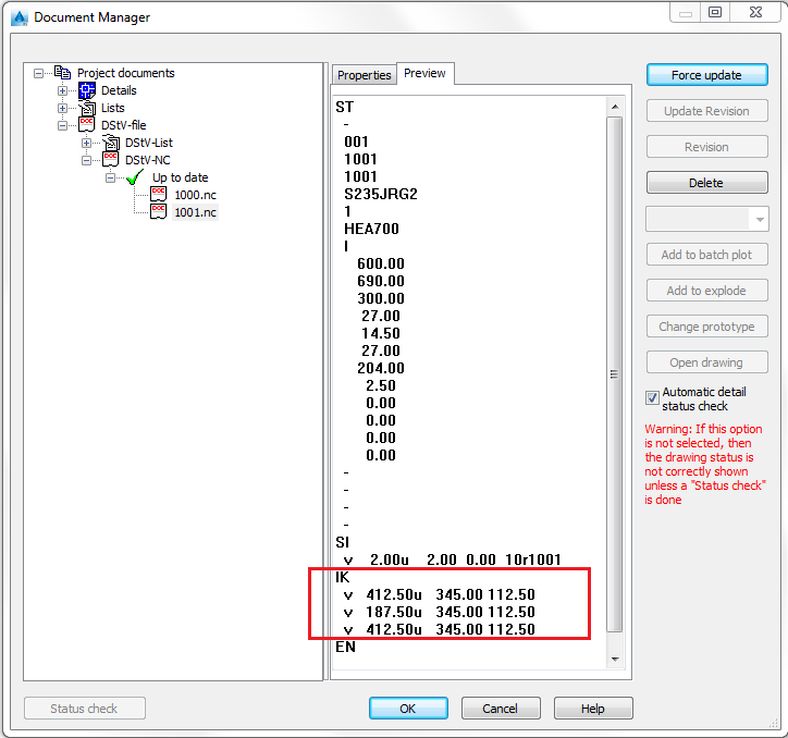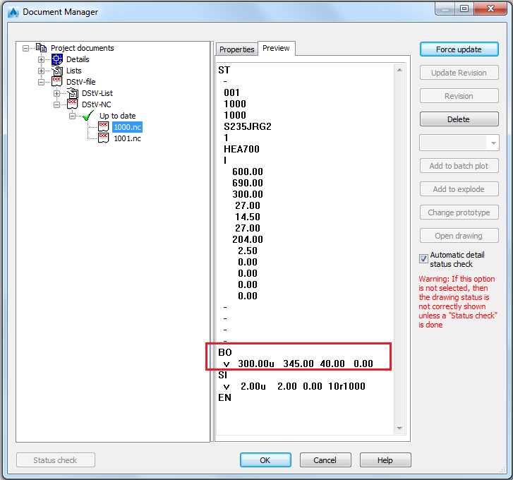 In our example, this default is set to 200, which means that if the size of the hole diameter is less than 200, the hole will be described in a BO Block (for holes), and if the hole diameter is exceeding 200 the hole will be described in a IK Block (for circular cut). As a result, for the beam having a hole diameter 40 on its web, you will get such NC-DStV file content: